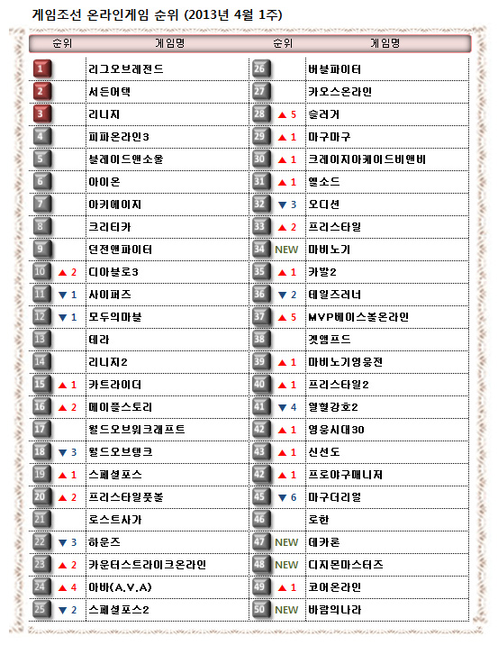 ... 4월 첫째 주(2012년 4월 1일 ~ 2013년 4월 7일) 온라인게임 순위입니다. 지난 주 온라인게임 순위를 살펴보면마구마구와 슬러거, MVP베이스볼온라인, 프로야구매니저등 야구 게임이 강세를 보였으며, 또한, 마비노기와 바람의나라 등 구작들이 다시 50위권안에