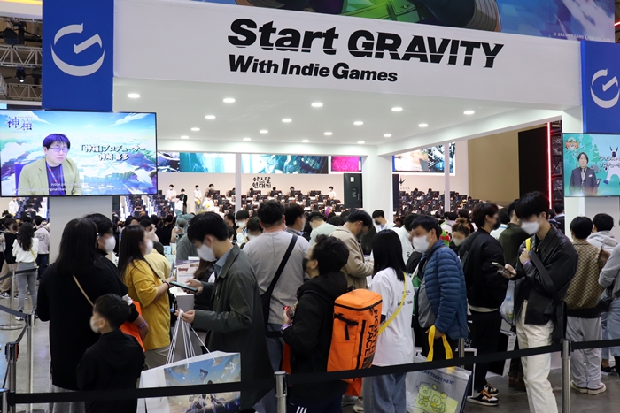 ... 특히 부스에서는 11종의 게임을 직접 플레이해 볼 수 있도록 총 24대의 PC 및 모바일 시연기기를 통해 다채로운 시연 기회를 제공하며 관람객들의 호평을 받았다. 부스 위쪽 대형 LED 화면에서는 출품작 13종에 대한 게임 소개 영상도 재생되어 지나가는 관람객들의 눈길을