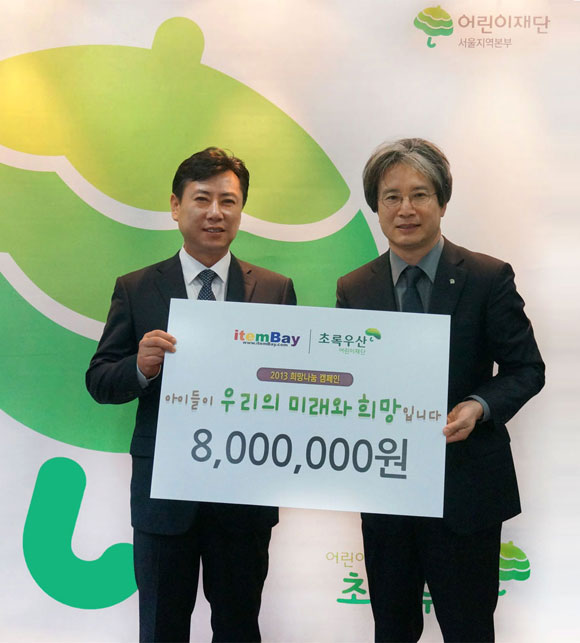 ... 아이템베이(대표 이창석)는 자사 사이트에서 진행한 ‘2013 희망나눔 캠페인’을 통해 적립한 후원금을 초록우산 어린이재단의 ‘미래와 희망 인재육성 사업’에 전달했다고 9일 밝혔다. 지난 3월 8일부터 1개월간 고객참여형으로 진행한 이 캠페인을 통해 약 300만원 가량이