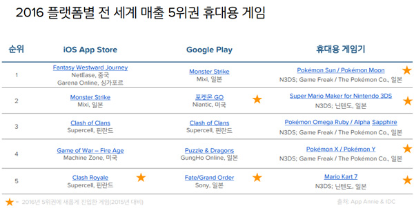 ... 지속적인 상승 곡선을 그린 모바일게임은 2016년에는 가정용 콘솔 게임의 두 배 이상을 상회하고 온라인게임보다 25% 이상 높은 수치를 기록했다. 특히 모바일게임 양대 앱마켓(애플앱스토어/구글플레이) 지출에서 아시아-태평양 지역이 전체 60% 이상을 차지하며 모바일게임 급성장을