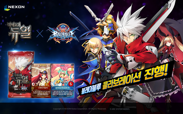 ...회사 측은 오는 16일까지 3차에 걸쳐 콜라보레이션 카드 24종을 무작위로 획득할 수 있는 ‘블레이블루콜라보부스터’를 오픈한다. 캐릭터 카드 대사는 원작과 동일하다. 아울러 부스터 구매 횟수 및 카드 획득 조건 달성 시 ‘라그나’ ‘진’ ‘레이첼’ ‘노엘’ 등 4종 영웅 지급 이