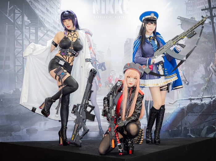 ... 레벨 인피니트가 지스타 2022 제2전시관 3층에 부스를 선보였다. 부스에 마련된 포토존에서 니케(캐릭터) 코스프레를 한 코스어 3명이 포즈를 취하고 있다. 좌측부터 미하라, 라피, 디젤 순
