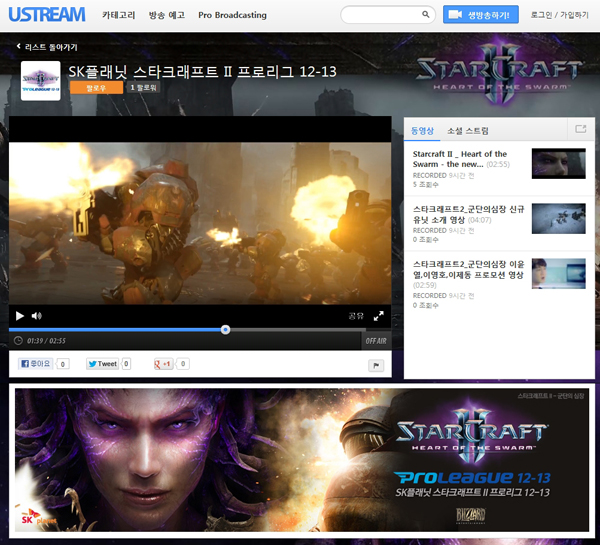 ... 유스트림을 통해 전 경기가 전 세계에 생중계되는 것은 이번이 처음이다. 해외에 있는 팬들도 경기를 실시간으로 시청할 수 있는 기회가 열렸다. 이용자는 경기를 시청하기 위해서 인터넷에서 유스트림 'SK플래닛 스타크래프트 II 프로리그 12-13 공식 채널을 방문하면된다