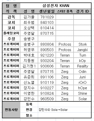 ... 한국e스포츠협회는 4일 프로리그 4월 로스터를 발표했다. 이에 따르면 웅진에 새로 임진묵과 김한샘이 등록됐으며 SK텔레콤에 최민수와 원이삭이 새로 합류해 눈길을 끌고 있다. 또한 은퇴 논란이 일고 있는 신상문이 CJ 엔투스 로스터에서 빠지며 주목을 받고 있다
