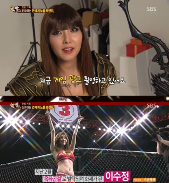 ... 이날 방송은 중세시대 여전사를 연상케 하는 복장으로 게임광고 촬영에 한창인 이수정의 모습을 담았다. 방송직후 각종 온라인커뮤니티에는 해당 게임에 대한 누리꾼들의 문의가 이어졌다. 이수정이 홍보모델을 맡은 게임은 바로 CJ E&M 넷마블의 모나크였다