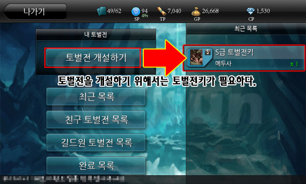 ... 혼자서 쉽게 클리어할 수 있는 모험과 달리 다 수의 인원이 총력전을 기울여야 하지만, 토벌전 수행 완료 시 GP, SP, 카드 조각같은 보상도 얻을 수 있으니 되도록이면 플레이할 것을 추천한다. ① 1. 토벌전 개설 및 참여하기 토벌전을 진행하는 방법은 자신이 토벌전을 직