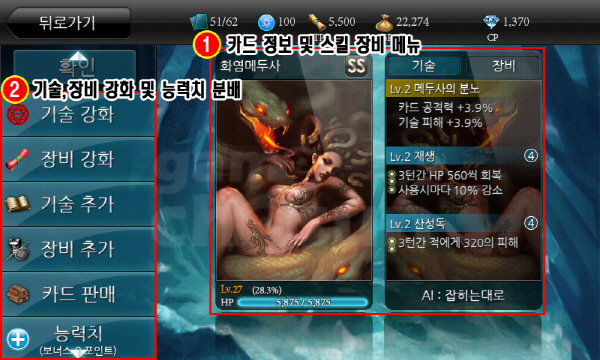 ... 즉,각 카드가 자신의 캐릭터, 무기라고 할 수 있는것. 카드는 고유의 등급과 스킬을 가지고 있어 카드마다 특성이 다르며, 능력치 배분을 통해 카드를 성장시킬 수 있다. 또, 모험에서 얻을 수 있는 장비를 카드에 장착할 수도 있어 유저의 입맛대로 육성할 수도 있다