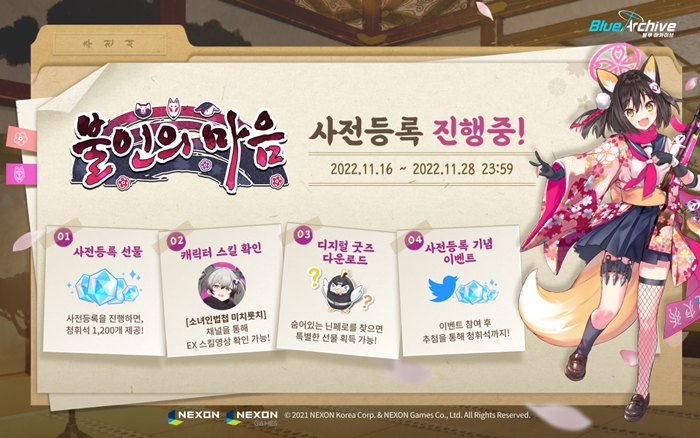 ... 넥슨은 사전등록과 함께 다양한 이벤트를 진행한다. 먼저, 사전등록 페이지에서 ‘닌페로’ 페이퍼토이 도안을 제공한다. 또, 페이지 곳곳에 숨어있는 ‘닌페로’를 찾으면 각종 디지털 굿즈를 다운로드 할 수 있다