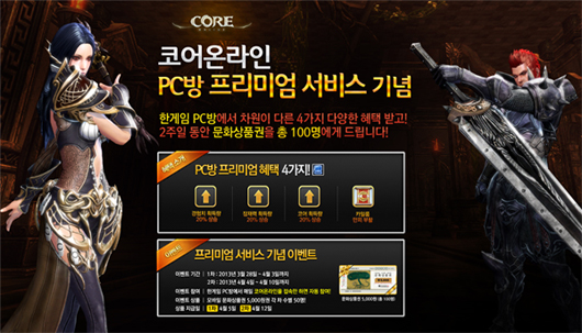 ... PC방에서 '코어온라인'을 즐기면 '경험치 획득량 20% 상승' '잠재력 획득량 20% 상승' '코어 획득량 20% 상승' '카일룸에서 사망 시 만피 부활'과 같은 4가지 혜택을 누림과 동시에 매주 50명씩 총 100명은 추첨을 통해 문화상품권 5000원을 받을 수 있다.