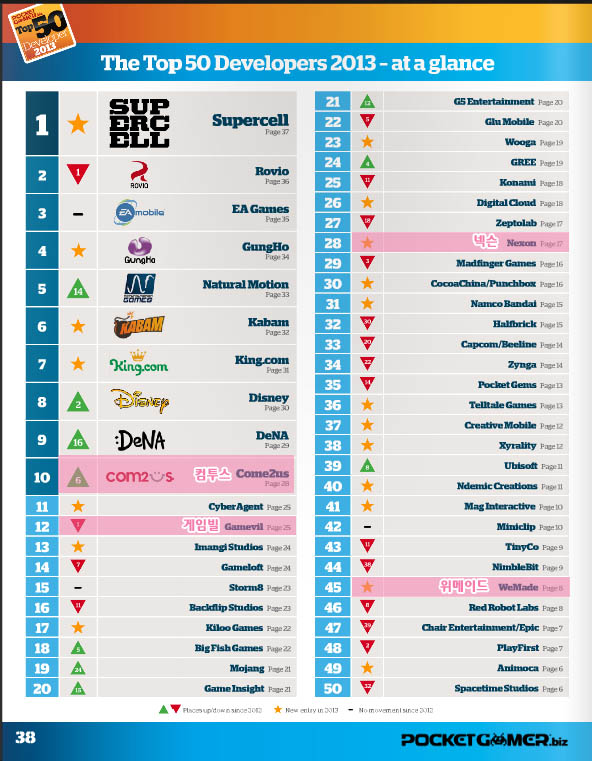 ... 1위는 '클래시오브클랜즈'와 '헤이데이'를 개발한 슈퍼셀로 자국을 대표하는 게임 앵그리버드 시리즈의 로비오를 제쳤다. 3위는 심슨과 리얼레이싱3, 피파13, 비주얼드블릿츠 등을 내세운 EA게임즈가 차지했고 4위는 '퍼즐앤드래곤'으로 전 세계 매출1위를 달성한 겅호가 수직상승했다.