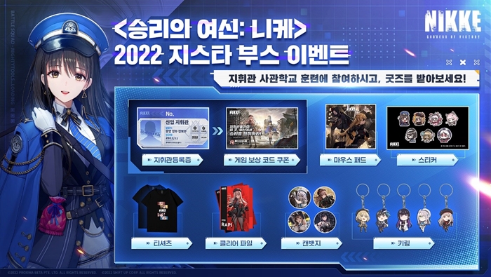 ... 부스 위치는 제2전시관 좌측 E-01에 자리 잡았으며, 관람객을 위한 게임 시연대는 물론 코스플레이어와 포토 타임을 포함한 무대 이벤트와 현장 이벤트 등 다채로운 행사가 펼쳐친다. 특히 공식 라운지 가입, 유튜브 채널 구독, 니케 매칭 테스트, 랩쳐 사격 훈련 등 미