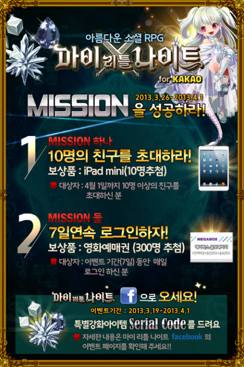 ... 또한 공식페이스북을 통해 강화전용 아이템 3종의 무료쿠폰을 제공하는 이벤트도 병행실시하고 있다. 마이리틀나이트는 이용자가 직접 꾸미는 작고 귀여운 캐릭터들을 중심으로, 리그전을 통해 상대 기사단과 경쟁하는 소셜 역할수행게임(RPG)이다. 한편 GMO 측은 조만간 마
