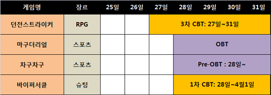 ... 27일 던전스트라이크가 3차 테스트를 통해 신작 출시의 서막을 알리고 28일 신작 게임들의 본격적인 테스트 및 공개서비스가 진행된다. 특히 넷마블은 프로야구 개막 이틀 전인 28일 야구와 축구를 대표하는 2종 게임을 각각 선보이며 스포츠게임 시장의 왕좌를 노린다. 네오위즈는