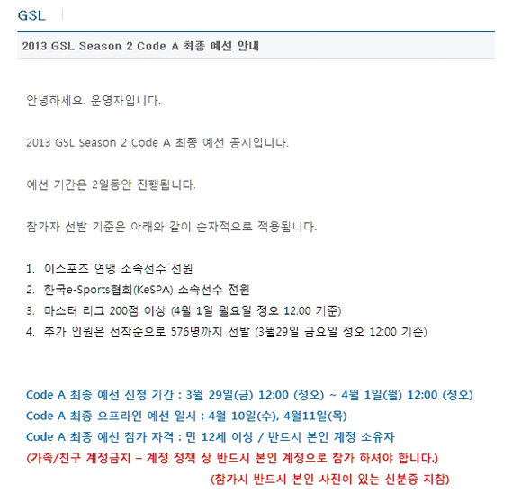 ... 이번 코드A는 이스포츠 연맹과 e스포츠협회(KeSPA)에 속한 선수 전원을 대상으로 진행되며, 마스터 리그 200점 이상(4월 1일 월요일 12시 기준)인 만 12세 이상인 유저를 대상으로 진행된다. 코드A 최종 예선 신청 기간은 오는 29일 12시부터 다음달 1일 정오까지