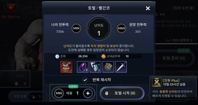 ...■ 토벌 및 특수 토벌 배율 입장 이벤트토벌 콘텐츠 특별 이벤트는 유저의 토벌 우두머리 지식 레벨 수준만큼 토벌 또는 특수 토벌 추천서의 소모 배율을 설정할 수 있다. 지식 레벨 5 단위마다 배율을 1씩 증가시킬 수 있으며 지식 레벨 96부터 100까지는 최대 배율을 20까지 설