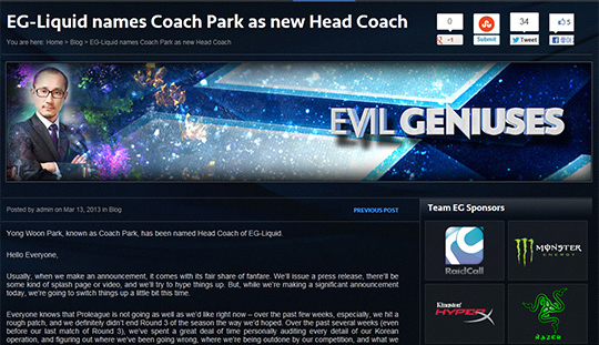 ... EG는 박 감독 선임이유로 프로리그 성적을 꼽았다. EG-TL은 이블 지니어스와 팀 리퀴드 등 두 해외팀의 연합으로 시즌 초까지만 하더라고 가장 강력한 다크호스로 꼽혔다. 하지만 해외 선수들이 국내 리그에 적응하는데 어려움을 겪었고, 국내 선수들 역시 이렇다할 할약을 하지 못