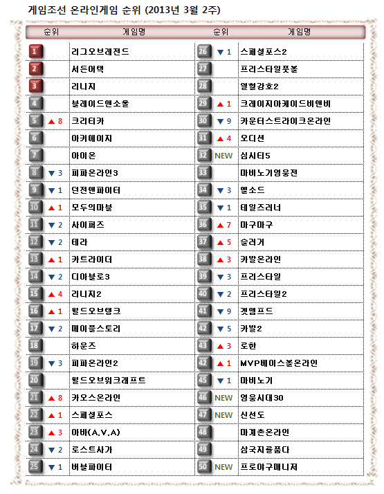 ... 3월 둘째 주(2012년 3월4일 ~ 2013년 3월10일) 온라인게임 순위입니다. 오랜만에 상위권 온라인게임 순위가 변동됐습니다. 매 주 순위가 상승하고 있는 MORPG '크리티카'가 5위에 랭크되며 2월 3주 이후 변동 없던 한 자리 순위들이 소폭 변화했습니다