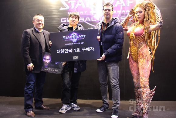 ... 11일 서울 광진구 악스홀에서 열린 스타2 군단의심장 발매 행사장에서 1호 구매자가 블리자드 엔터테인먼트 이치크 벤 바셋 부사장과 블리자드 코리아 백영재 대표에게서 군단의 심장 소장판과 각종 추가 상품을 받고 기뻐하고 잇다. [오경택 기자 ogt8211@chosun.