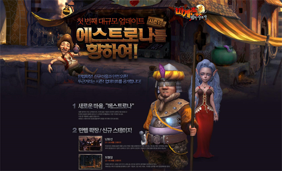 ... 이번 업데이트에서는 최고 레벨이 기존 30에서 40으로 확장되고 '에스트로나' 마을 등 신규지역이 대거 추가된다. 새로운 무대인 에스트로나는 세른 왕국의 주요 교역로이자, 마계 침공 거점의 마지막 보루다. 이용자들은 일반 스테이지인 '난파선' '처형장' '몽환계' '해충