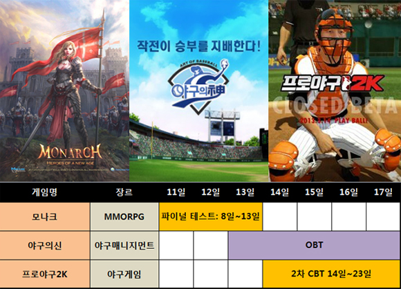 ... 또한 국내 프로야구 개막 시즌이 다가옴에 따라 2종의 야구게임이 모습을 드러내며 흥행의 첨병 역할을 할 심산이다. 야구의신은 수차례의 테스트를 거친 끝에 오는 12일 공개서비스에 돌입하고, 프로야구2K는 한층 강화된 콘텐츠로 두 번째 테스트를 준비한다. ◆ '모나크',
