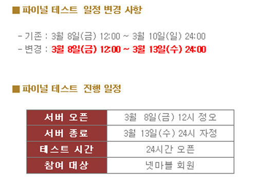 ... CJ E&M 넷마블이 서비스 예정인 변태 MMORPG '모나크'의 최종점검을연장했다. 모나크의 파이널 테스트는 당초 지난 3월 8일부터 10일까지3일동안 진행될 예정이었으나최종점검 마지막날인 10일 공식홈페이지를 통해13일까지로 연장한다고 밝혔다. 공식 홈페
