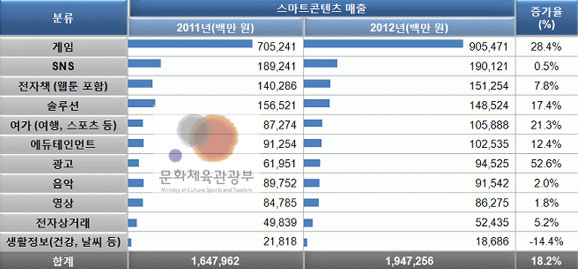 ... 전체 스마트콘텐츠 중 게임을 포함한 문화 콘텐츠가 차지한 비중은 전체의 79%로 게임(46. 4%), 전자책(7. 7%), 음악(4