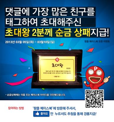 ... 회사 측은 이벤트 참여자를 대상으로 추첨을 통해 ‘아이패드 미니’와 ‘문화상품권’ 등 다양한 경품을 제공할 예정이다. 특히 친구 태그 댓글을 가장 많이 남긴 방문자 2명을 ‘팜플 초대왕’으로 선정, 순금으로 만든 감사패를 증정한다. 한편 팜플은 지난달 13일 공식페이스