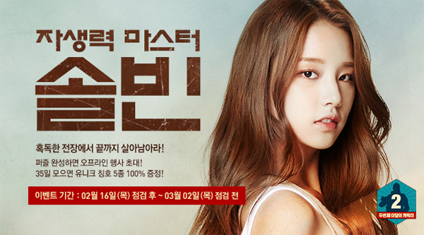 ...이와 함께 다섯 번째 챌린지 ‘자생력’ 마스터의 주인공으로 라붐의 ‘솔빈’ 캐릭터를 출시했다. 이를 통해 ‘애교 생존댄스’ ‘솔빈의 막춤’ 등 전용 감정표현을 비롯해 실제 음성효과 등을 지원한다. 넥슨은 이번 신규 캐릭터 출시를 기념해 3월 2일까지 ‘솔빈 카운트 캐릭터 세트(7