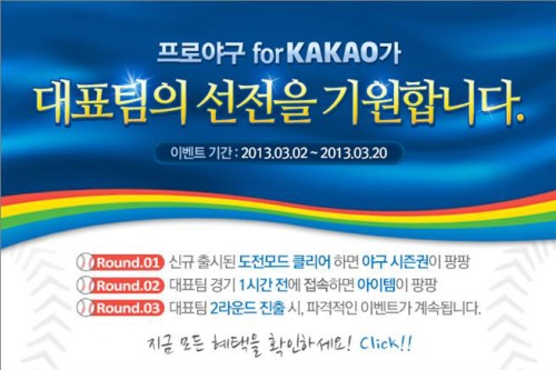... 또 실제 대한민국 경기가 있는 당일에는 경기 시작 한 시간 전에 게임에 접속한 유저 전원에게 1만 튠(게임머니)을 지급하고, 대표팀의 8강 진출시 ‘중급팩’ 10장, 4강 진출시 ‘특수팩B’ 3장, 결승 진출시 ‘특수팩B’ 5장을 선물한다. ‘넥슨 프로야구마스터 2013’에