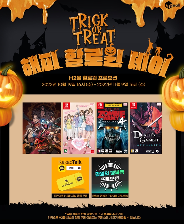 ... [자료제공 = 에이치투 인터렉티브] 에이치투 인터렉티브(이하 H2 INTERACTIVE, 대표 허준하)는 패키지 쇼핑몰인 H2몰에서 오늘(10월 19일)부터 할로윈 및 사이버펑크 2077 할인 프로모션을 진행한다고 밝혔다. H2몰에서 진행되는 이번 프로모션은 10월