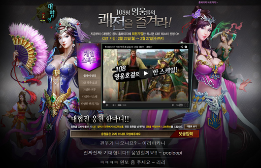 ... 이엔피게임즈는 대협전 CBT를 기념해 접속만 해도 VIP 등급을 부여하는 'VIP 특별한 혜택' 이벤트와 공식 페이스북의 '좋아요' 누적량에 따라 원보를 지급하는 이벤트를 진행한다. 이엔피게임즈 김용석 실장은 "대협전은 수호지 108명 영웅을 모으는 재미와 육성, 전략, R