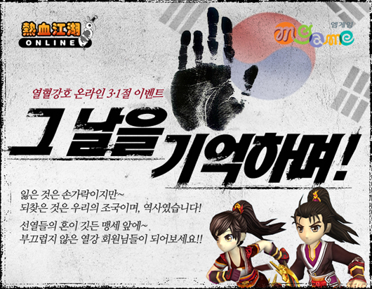 ... 또 오후 3시부터 11시까지 총 8시간 동안 접속하는 모든 유저에게 경험치 및 기연 획득이 증가하는 순국선열 버프 혜택을 제공하며 현발파 허신의 NPC(보조캐릭터)를 통해 삼일절 기념 태극기 아이템을 구입하여 사용하면 캐릭터명 상단 태극기 아이콘 표기는 물론 내공 상승의 혜택을