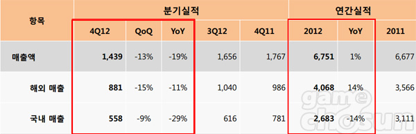 ... 넥슨과 엔씨소프트는 지난해 각각 1조 5천275억원과 7535억원으로 최고 매출을 갱신하며 나란히 1, 2위 자리를 차지했다. 네오위즈게임즈는 6751억으로 3위를 기록했고 뒤를 이어 NHN한게임(6084억)과 CJ E&M 넷마블(2121억) 순으로 집계됐다. 그러