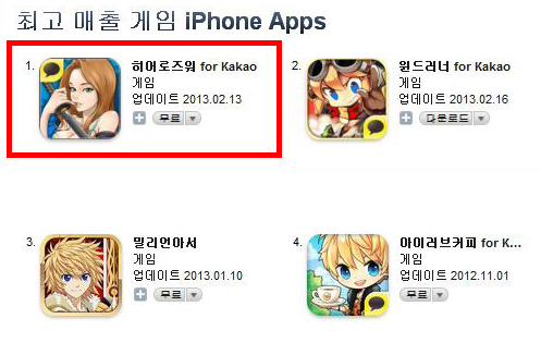 ... 특히 서비스 4일 만에 앱스토어 무료게임 순위 정상을 차지했으며, 현재 구글 플레이의 최고매출과 인기순위에서 각각 3위, 6위에 랭크됐다. 특히 18일 현재 앱스토어 최고매출 순위 정상에 오르는 등 꾸준한 상승세를 이어가고 있다. 한편 히어로즈워는 카카오