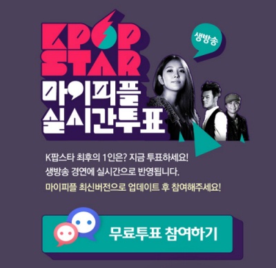 ... 마이피플 앱을 설치한 후 ‘친구 추가’ 메뉴에서 ‘K팝스타 투표봇’과 친구를 맺으면 오는 17일부터 4월 7일까지, 생방송이 시작되는 매주 일요일 저녁 5시부터 실시간 투표에 참여할 수 있다. K팝스타 투표봇에게 지지하는 후보의 번호 또는 이름이나 팀명을 메시지로 전송하면