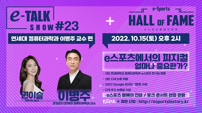 ... ‘e-토크쇼’는 전시관 체험 프로그램 중 하나로 2019년부터 여러 관계자들을 초청해 e스포츠 경험담을 직접 나누고 있다. 실제로 전·현직 프로 선수, 종목사 관계자, 기자, 해설자, 방송 PD, 후원사 등 다양한 업계 전문가들이 연사로 참여해
