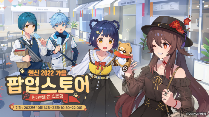 ... 방문객들은 원신 테마로 꾸며진 환상적인 공간에서 굿즈판매존, 모험가 길드존, 미니게임존, 포토존, 플레이존, 도넛존 등 다양한 이벤트존을 통해 잊지 못할 추억을 남길 수 있다. 굿즈판매존에는 한국에서 처음 공개되는 티바트동물원 굿즈를 포함하여 가을 팝업스토어 굿즈 등