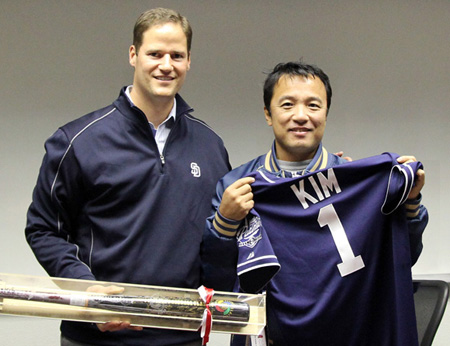 ... 케빈 오말리는 전 LA 다저스 구단주 피터 오말리의 장남으로, 지난해 8월 프로골퍼 필 미켈슨 등과 파드리스를 인수했다. 케빈 오말리 구단주는 김택진 구단주의 이니셜이 새겨진 유니폼을 선물하며 돈독한 교류를 약속했다. 김택진 구단주는 답례로 기념배트를 전달했다