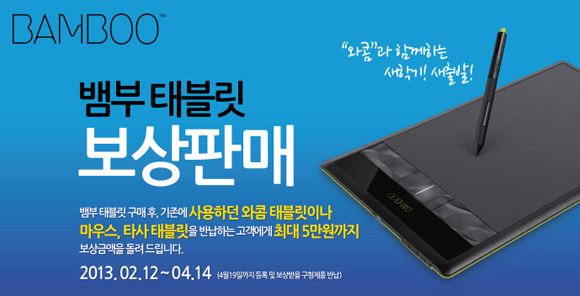 ... 보상 금액은 ▲Bamboo Fun(CTH-670) 50,000원 ▲Bamboo Pen&Touch(CTH-470) 30,000원 ▲Bamboo Comic(CTH-470S) 30,000원 ▲Bamboo Pen(CTL-470) 20,000원으로 구매 모델에 따라 각각 별도로