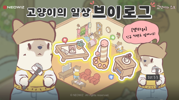 ... 가구코인으로 구매한 다양한 소품들을 활용하여 캣타워 내부를 꾸밀 수 있으며, 다양한 애니메이션 효과로 사랑스러운 고양이들을 감상할 수 있다. 이를 기념해 오는 10월 19일까지 기념 이벤트도 진행된다. 게임 내 등장하는 고양이의 선물을 확인하면 ‘캣타워 소품&