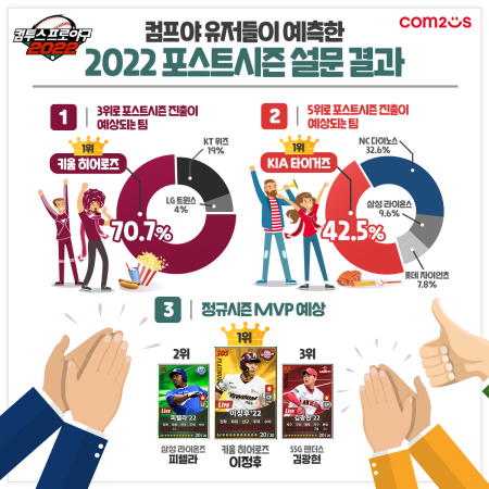 ... 이번 설문 이벤트는 지난 27일까지 약 일주일간 가을야구 진출이 유력할 것 같은 팀을 주제로 공식 카페 유저들을 대상으로 펼쳐졌다. 한국시리즈와 플레이오프 직행이 확정시 되는 선두권 팀을 제외하고 여전히 순위 싸움이 치열한 3위와 5위에 대한 설문이 진행됐다. 먼저