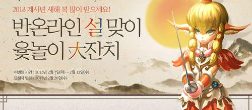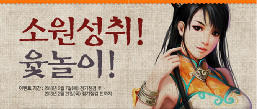 ... 윷놀이 이용권은 매일 3개가 주어지며 이용자는 이벤트 페이지의 윷놀이 플래시 미니 게임에 참가해 윷을 던져 나오는 결과에 따라 게임 내 아이템을 경품으로 받을 수 있다. 또 회사 측은 이벤트 참가자 중 추첨을 통해 1명에게 20강 영혼석, 각각 3명과 5명에게 15강, 10