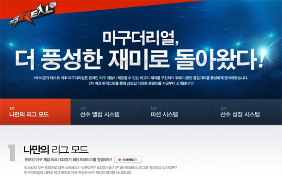 ... 특히, 프로야구 정규시즌 133경기와 포스트시즌을 경험할 수 있는 나만의 리그는 실제 프로야구 팀들의 데이터를 기반으로 한 컴퓨터(AI)와의 대결과 '빠른 결과보기'를 통한 시뮬레이션 진행이 가능하다. 애니파크 이건희 실장은 "실력이 부족해 다른 이용자와의 대결이 부담되는
