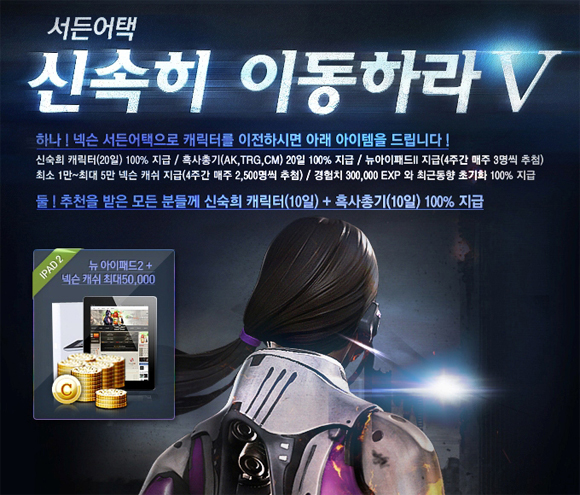 ... 이번 캠페인은 2월 한 달간 실시되며, 넷마블 서든어택 캐릭터를 보유한 유저가 넥슨 서든어택으로 캐릭터 이전을 완료하면 다양한 혜택을 제공하는 방식으로 진행된다. 우선 캠페인 기간 중 넥슨 서든어택 계정으로 이전한 유저 전원에게는 '30만 경험치'와 더불어 '신숙희 캐릭