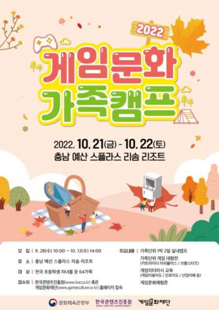 ... ■10월 충청남도 예산 개최 캠프, 가족 참여형 다양한 콘텐츠 운영 기대 캠프는 온 가족이 함께 즐길 수 있는 게임문화퀴즈대회, 게임문화체험존, 게임리터러시 교육, 가족 단위 이스포츠 대항전 등 다양한 체험 및 이벤트를 제공한다. 자녀가 좋아하는 최신 게임부터 부모님