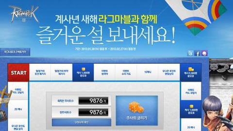 ... 이번 이벤트는 라그나로크2 공식 홈페이지에서 주사위를 굴린 후 나오는 숫자대로 이동하면 다양한 경품에 당첨되는 방식으로 누구나 참여할 수 있다. 주사위는 라그나로크2 1시간 플레이 할 때마다 1개씩 지급되며 상품은 스킬 초기화 주문서, 씨드 룬 랜덤상자, 캐시 1만원 응
