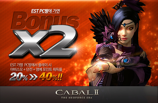 ... 이벤트 기간 중 EST 가맹 PC방에서 카발2를 플레이 하는 이용자는 게임 내 명예던전, 아비스모 포인트 획득률 2배 증가 혜택을 받을 수 있다. 기존 PC방 이벤트와 함께 총 40%의 확률 증가가 되는 것. 이번 이벤트는 다음달 12일까지 약 2주간 진행되며 전국 ES