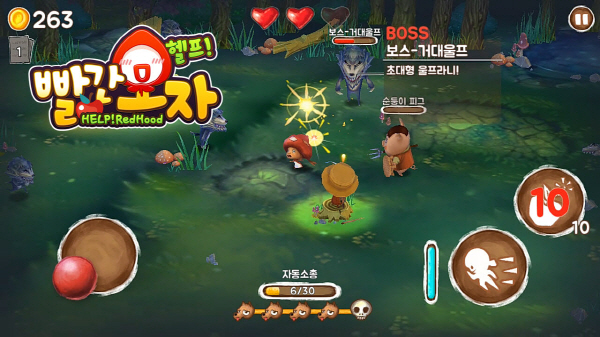 ... 귀여운 빨간모자, 돼지삼형제, 고트, 열혈 닌자 등 이용자들에게 친숙한 동화 속 캐릭터들이 등장하며, 사방에서 몰려오는 늑대들의 공격을 피하고, 땅에 떨어지는 무기 아이템들을 사냥꾼에게 전달해 늑대들을 물리치는 방식이다. 특히, 주인공 캐릭터인 빨간모자는 천사, 식인상어, 집주인
