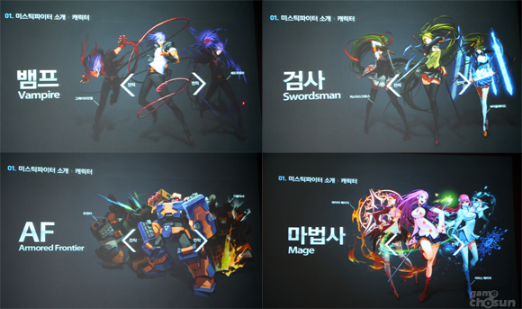 ... 미스틱파이터는 근미래 도시에 SF판타지 세계관을 구현한 횡스크롤 액션 MORPG로 개성 강한 캐릭터들의 조작을 통해 화려한 액션과 타격감을 즐길 수 있는 것이 특징이다. 이날 행사에서 공개된 캐릭터는 4종으로 흑마술을 사용하는 '뱀프', 빠른 검술이 특징인 '검사', 메카닉