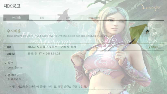 ... 공개된 구직공고에는 3년 이상의 모바일게임 기획경력과 리니지에 대한 이해도를 우대한다는 방침이다. 이를 종합해보면 엔씨소프트는 리니지의 IP(지적재산)를 활용한 신규 모바일게임 개발을 준비하고 있다. 특히 이번 프로젝트는 지난해 8월 그리와 계약했던 리니지의 모바일화 계약